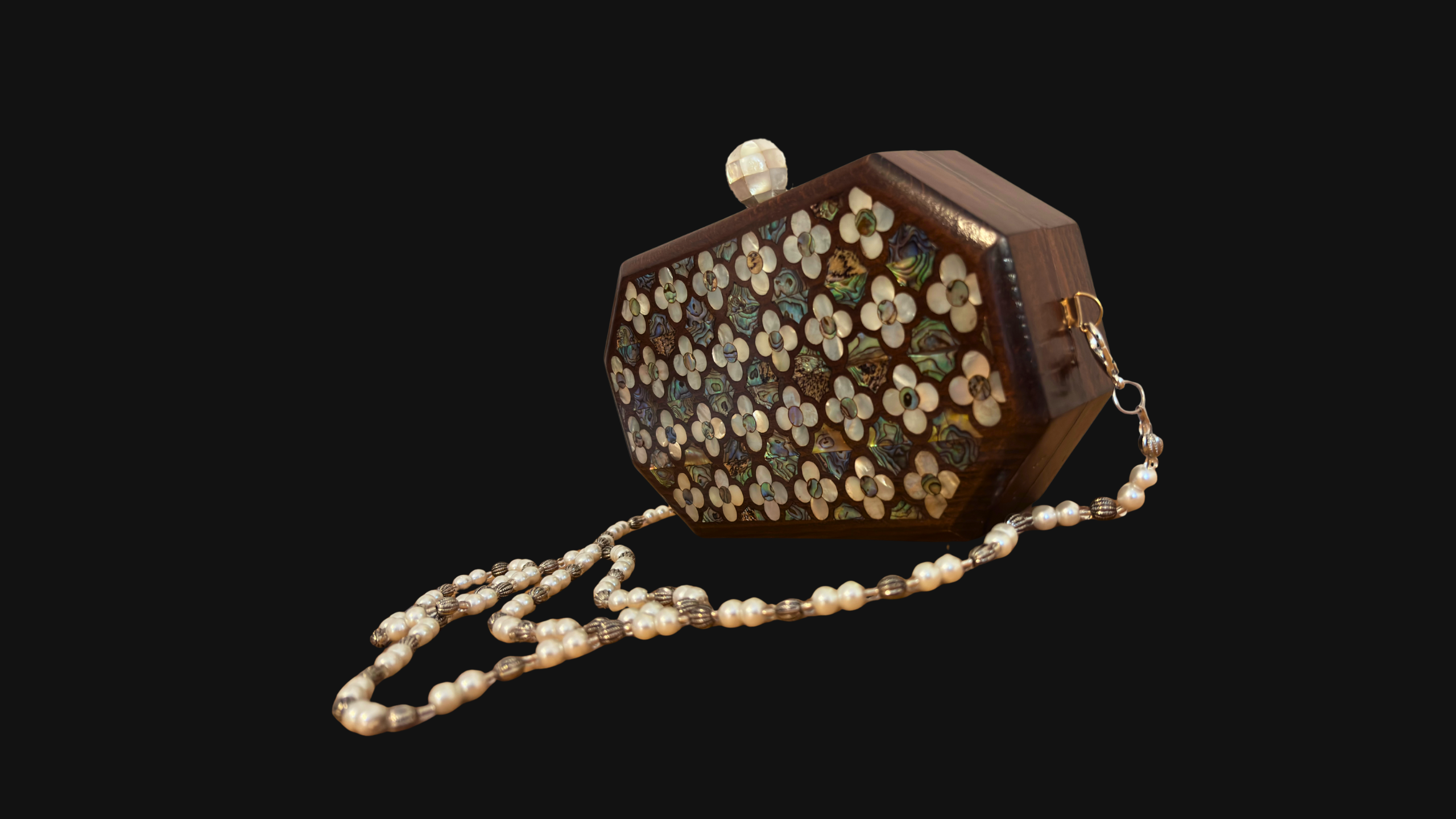 Jouri – Bolso Damasquino de Lujo con Nácar Floral y Cadena de Perlas