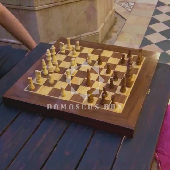 La superficie exterior presenta un tablero de ajedrez clásico, mientras que el interior revela un impresionante diseño de mosaico damasquino — una expresión de siglos de arte y tradición.