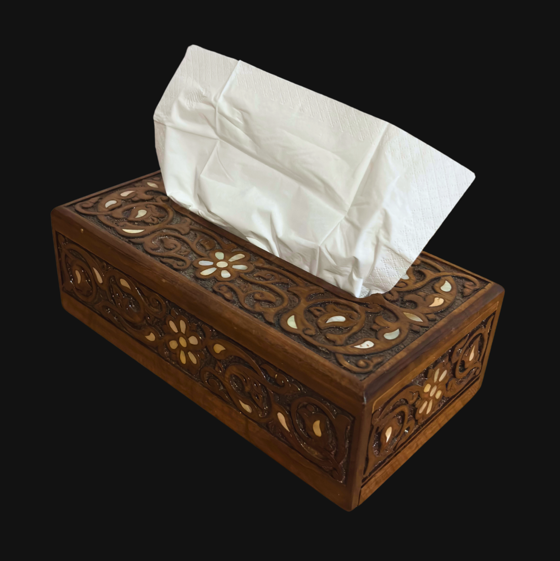 Caja de Pañuelos Tallada a Mano en Haya – Acabado Nogal con Nácar