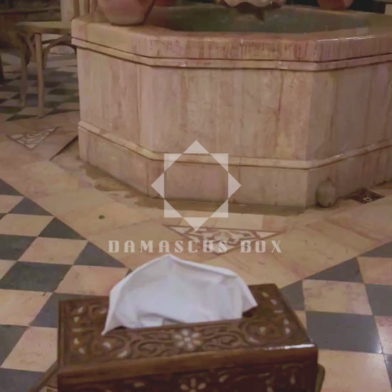 caja de pañuelos artesanal, incrustaciones de nácar, decoración damasquina, madera oriental, accesorio de lujo, arte de mosaico, Damascus Box