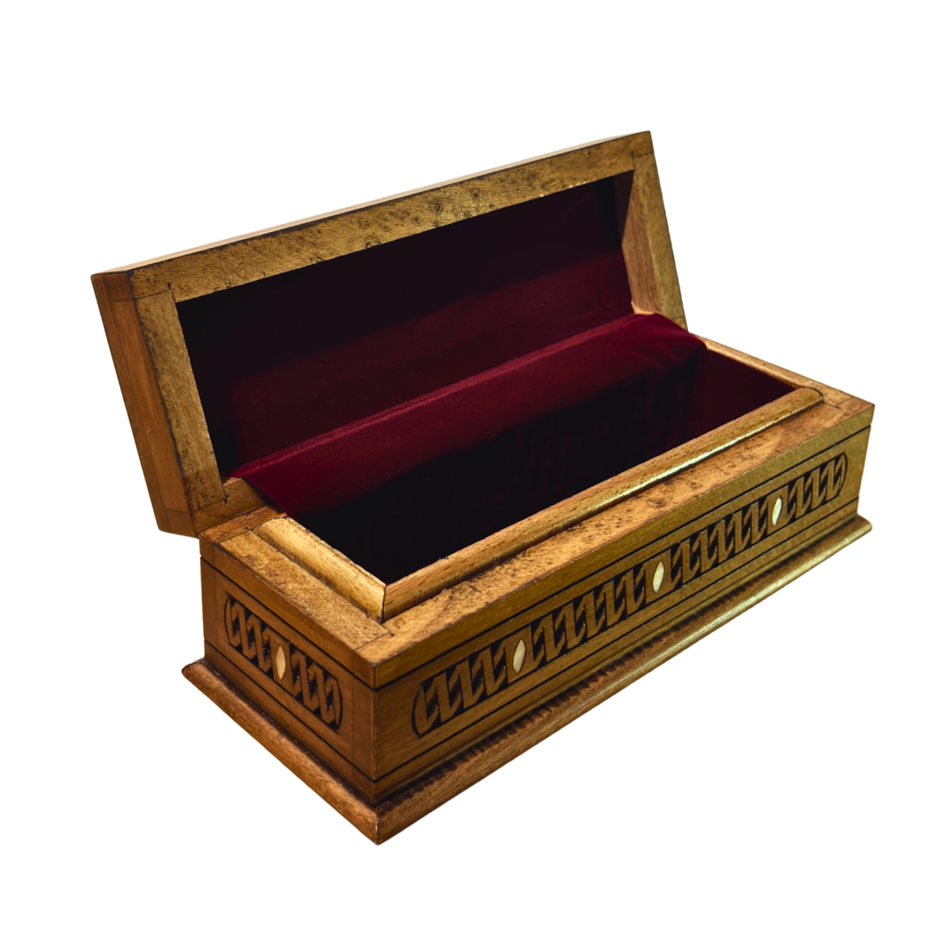 La finition en noyer clair et le velours bordeaux intérieur offrent élégance et protection pour bijoux, stylos ou chapelets.