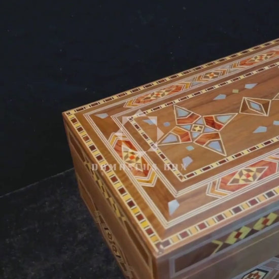 grande boîte mosaïque damascène, boîte à bijoux faite main, incrustation de nacre, boîte en noyer, hêtre, citronnier et pin jaune, boîte à souvenirs multiniveau, idée cadeau unique, cadeau fête des Mères, cadeau de mariage, cadeau d’anniversaire, boîte de rangement artisanale, boîte de Damas, boîte syrienne, cadeau pour elle, cadeau pour lui