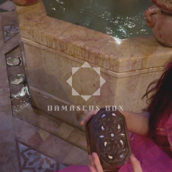 Questa raffinata scatola damaschina in legno è realizzata a mano in legno di faggio essiccato, con una splendida finitura color noce e decorata con autentiche intarsiature in madreperla.