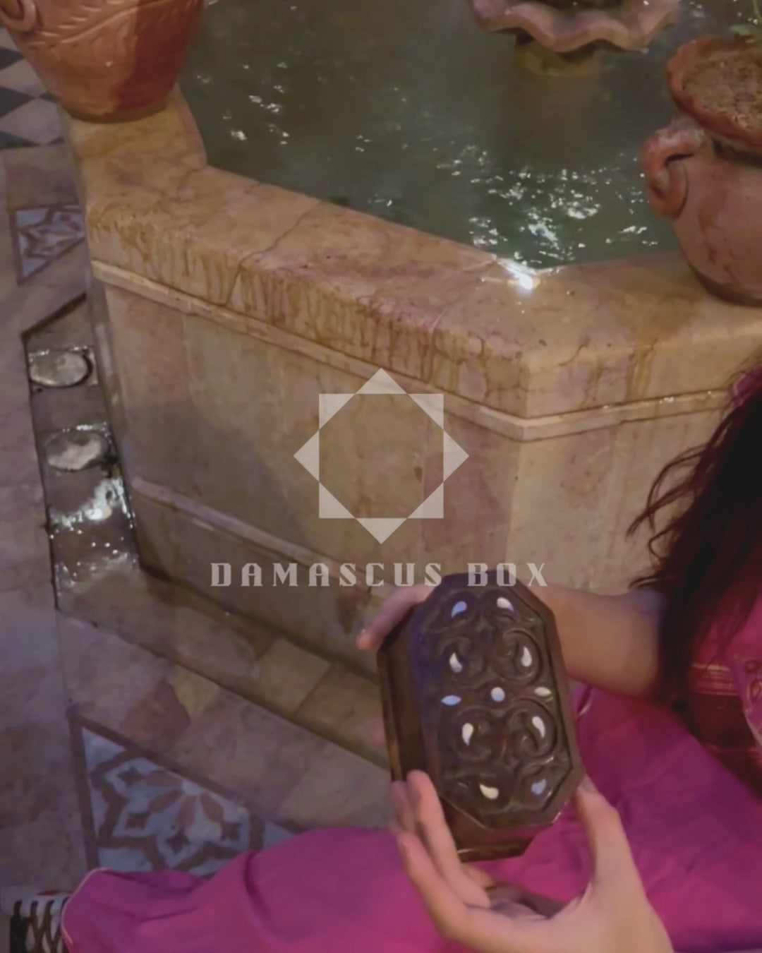 scatola in legno intagliata a mano, madreperla, arte damaschina, artigianato siriano, finitura noce, decorazione orientale, Damascus Box