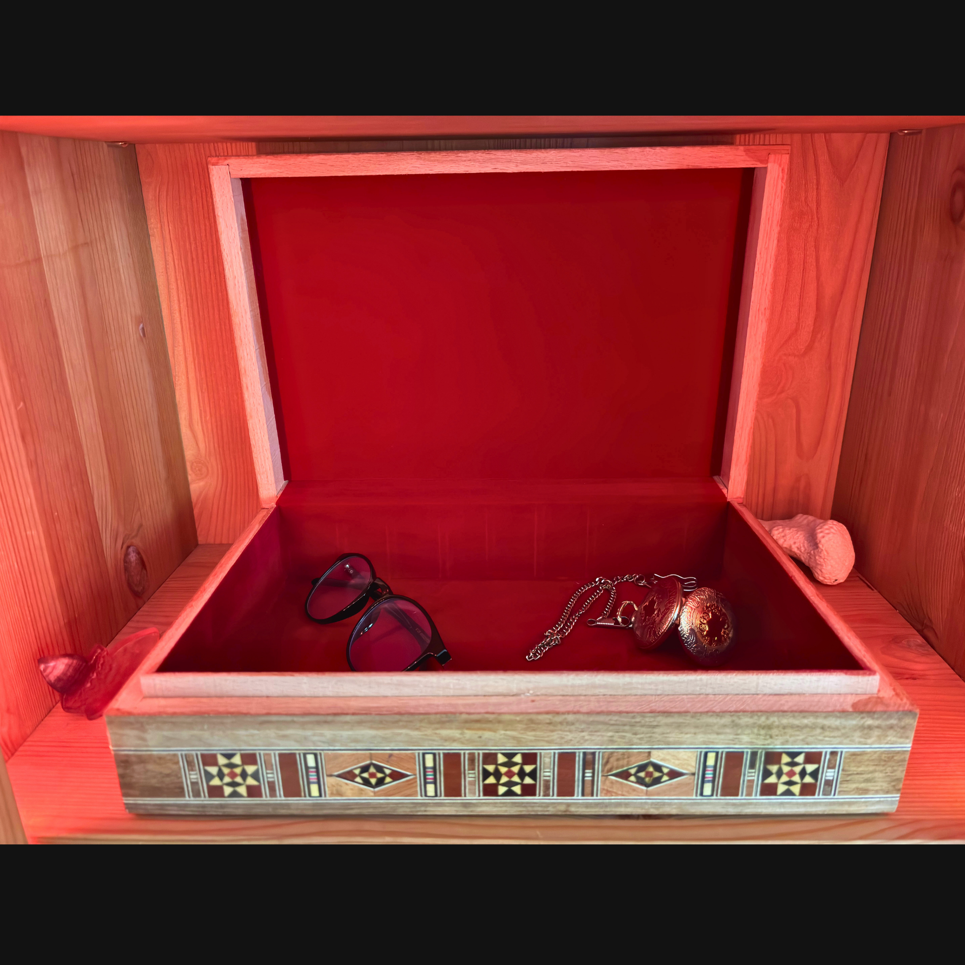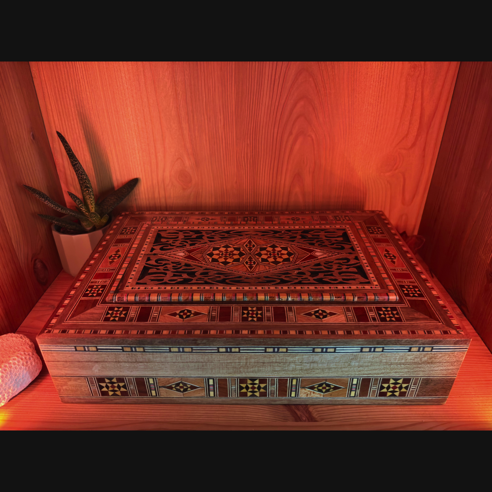 Scopri l'eleganza dell'artigianato tradizionale di Damasco con questa grande scatola rettangolare in mosaico , meticolosamente realizzata a mano in pregiato legno di faggio . Pensata per chi apprezza l'arte raffinata e il design senza tempo, questa scatola è perfetta per conservare in modo sicuro gioielli, orologi, sigari, delicati ricordi o ricordi preziosi.