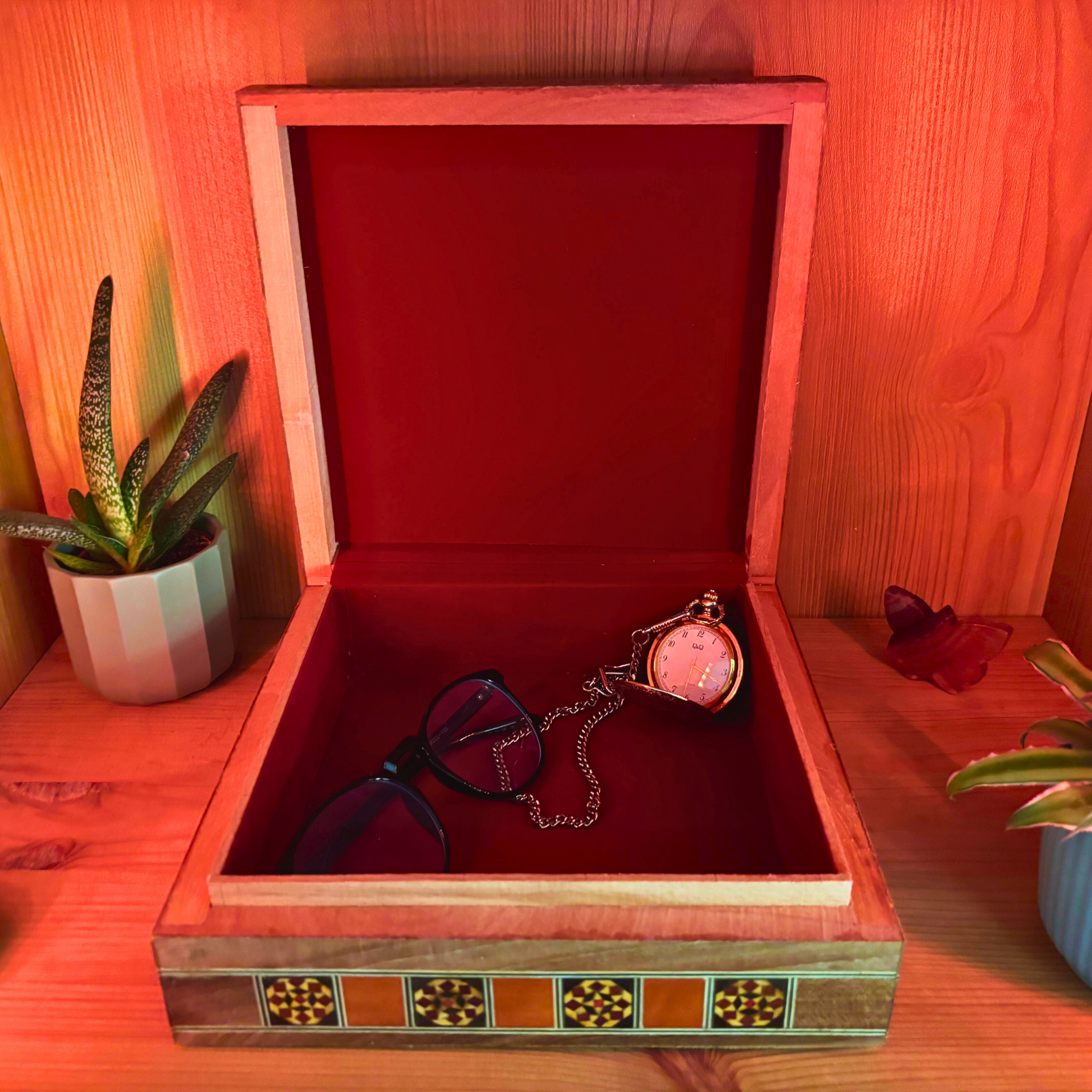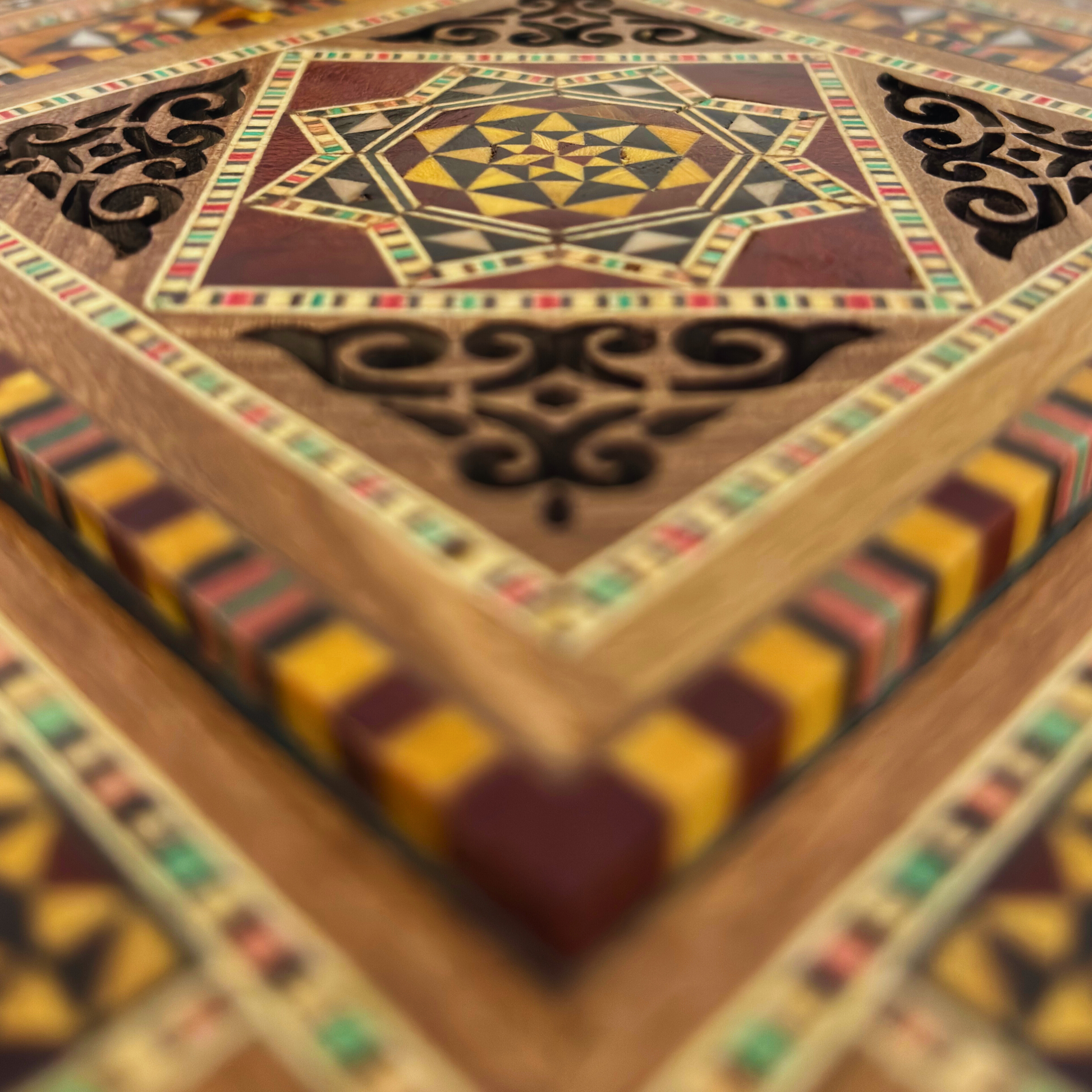 Realizzata in pregiato legno di faggio nella storica città di Damasco, questa scatola quadrata di medie dimensioni con mosaico è un esempio di squisita fattura artigianale e maestria artigianale tradizionale. Il suo elegante design a mosaico offre un modo sofisticato per conservare gioielli, preziosi oggetti, sigari o ricordi, unendo bellezza e praticità.