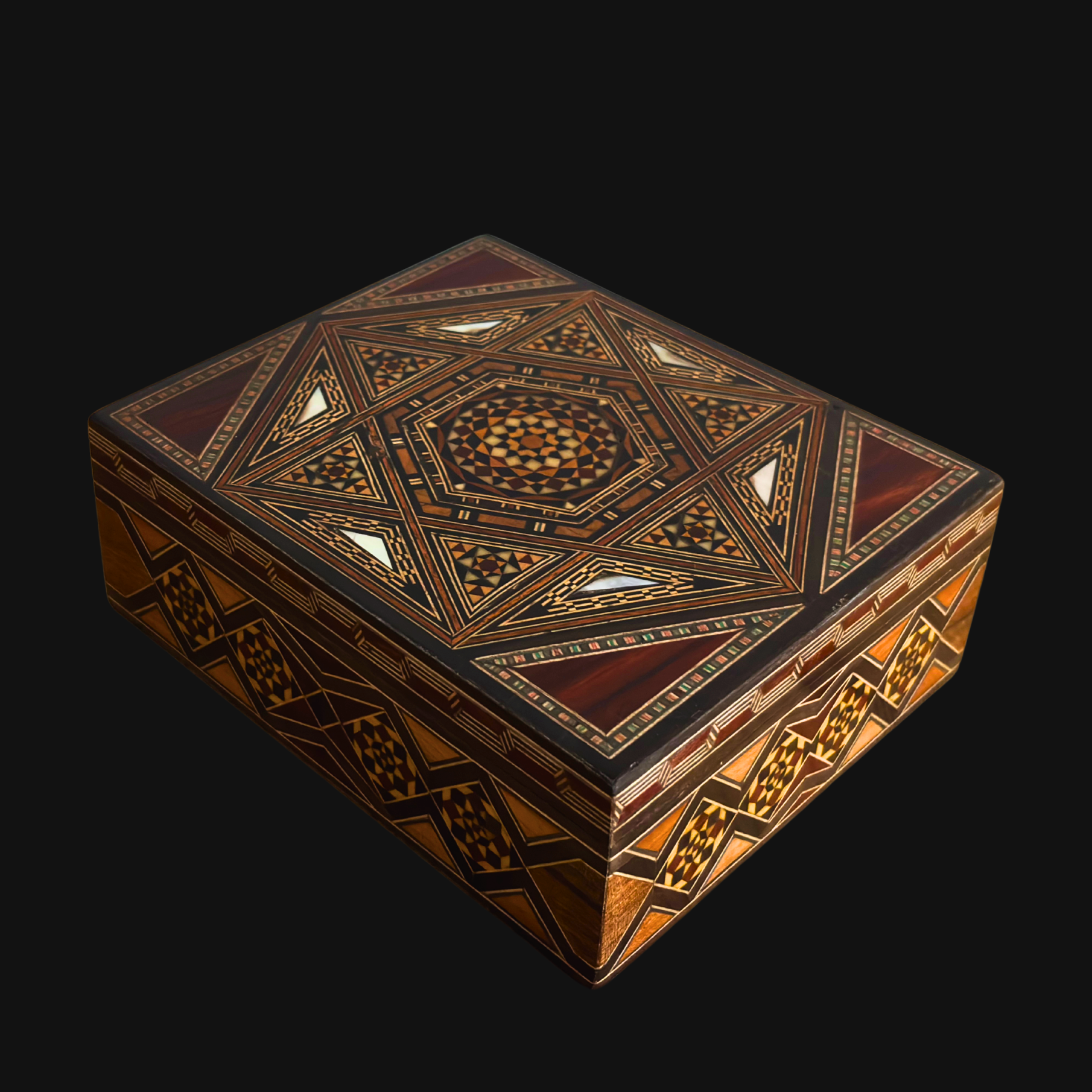 Questa scatola damaschina a mosaico è un’opera del celebre Gaby Al Dayeh, maestro artigiano di 90 anni considerato un simbolo vivente dell’arte del mosaico siriano.