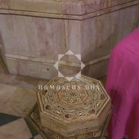 Deze elegante achthoekige Damascener doos toont de harmonie van houtbewerking en geometrische kunst.