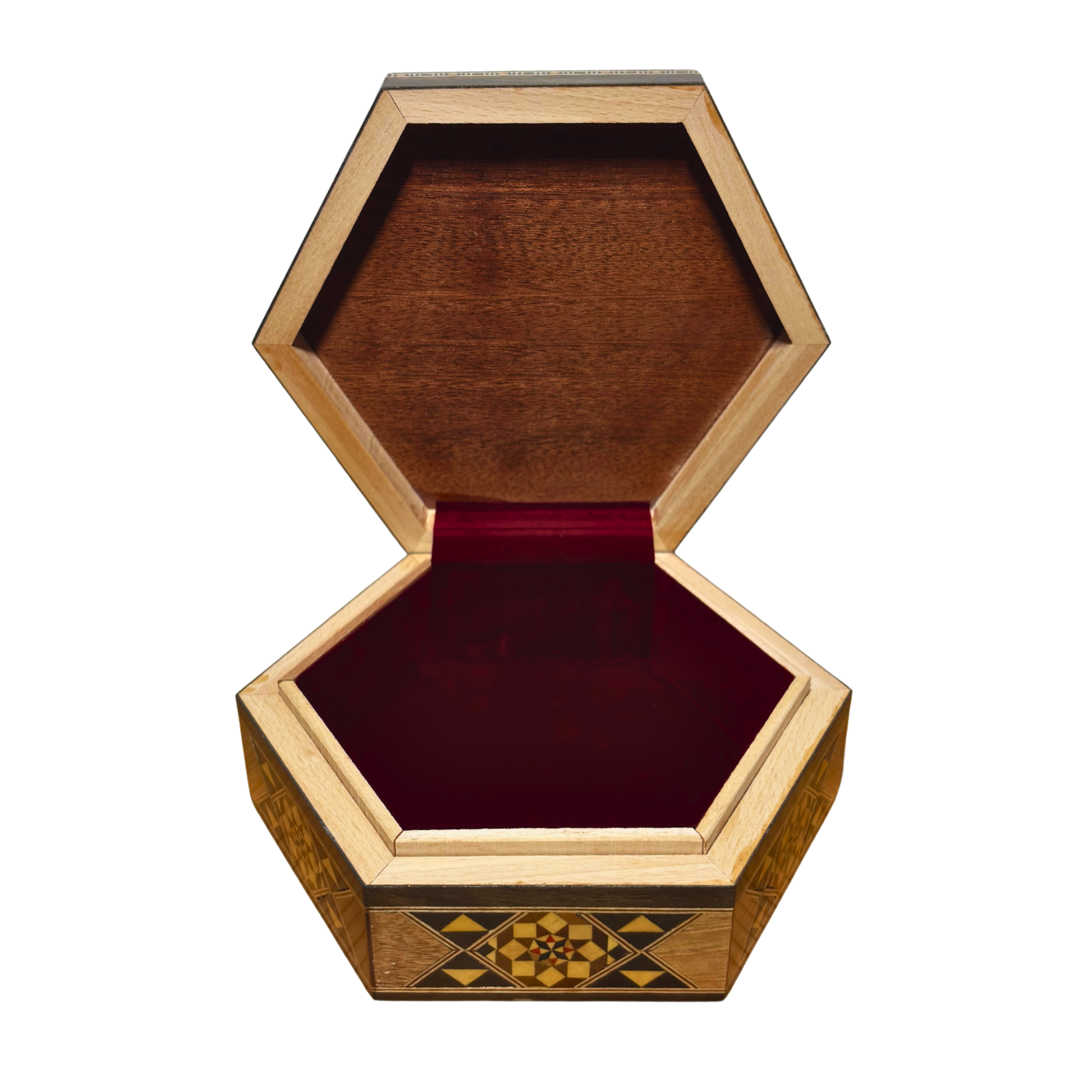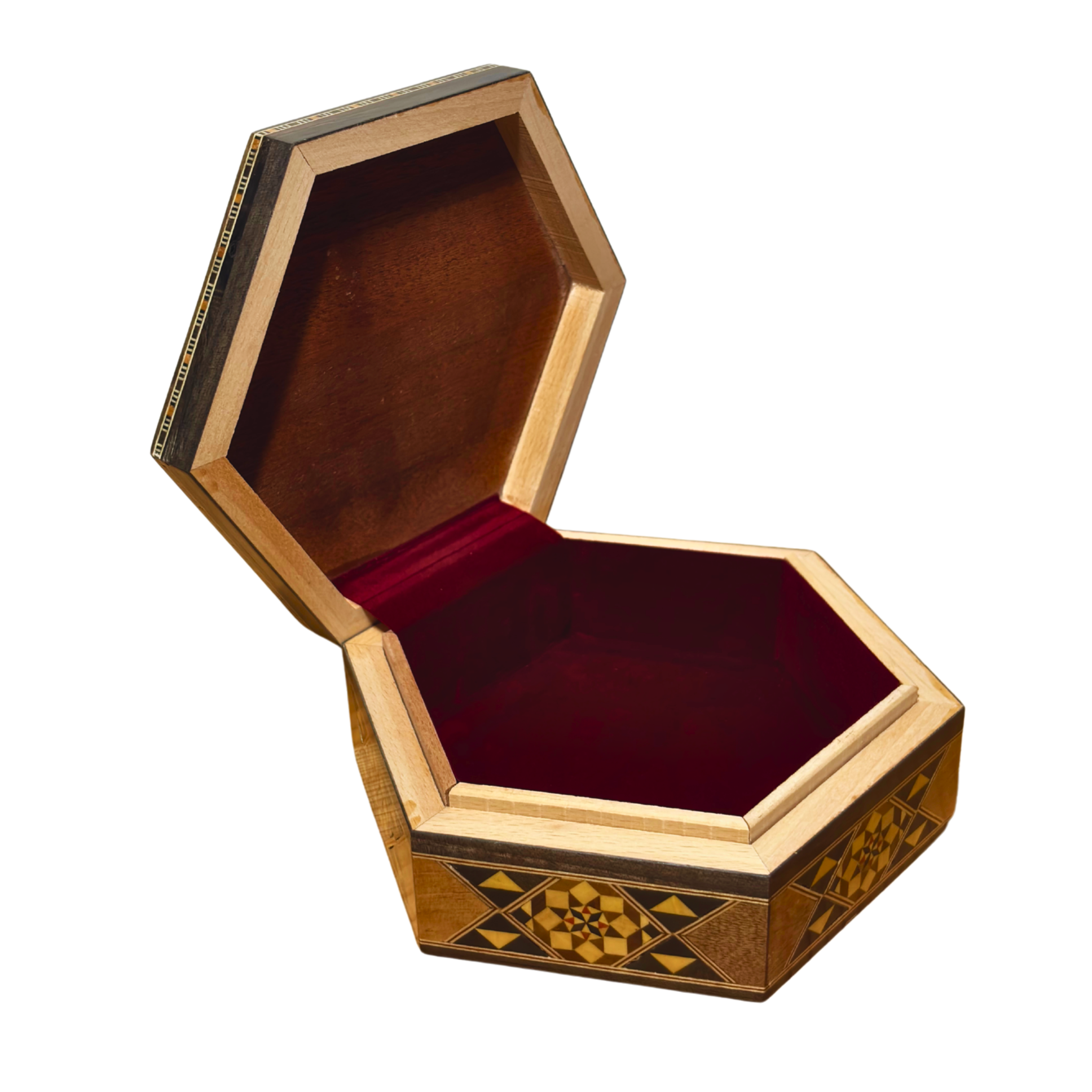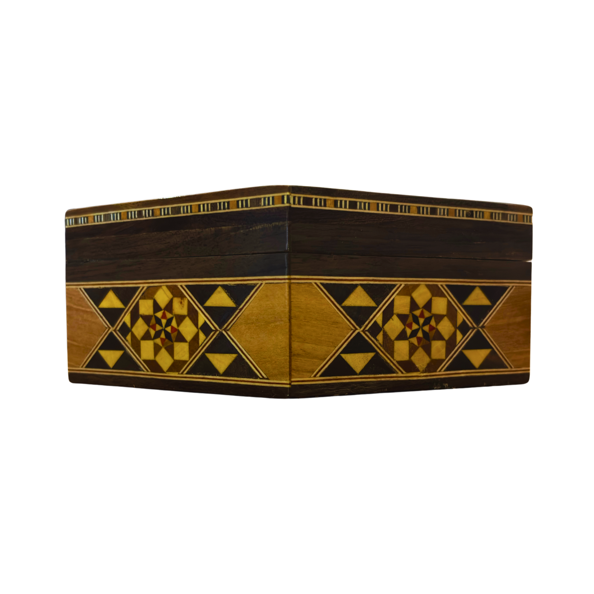 Deze verfijnde mozaïekdoos is vervaardigd uit walnoot-, beuken-, rozen- en citroenhout en is afgewerkt met authentieke parelmoerinleg. Een tijdloze combinatie van kunst, natuurlijke materialen en precieze afwerking.