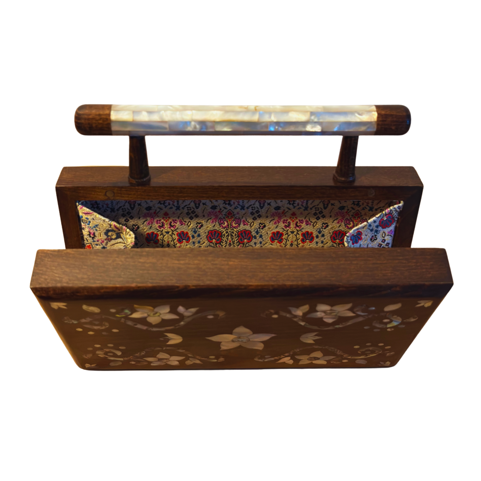 damasceńska torebka, masa perłowa, drewno orzechowe, brokat, orientalna elegancja, Damascus Box