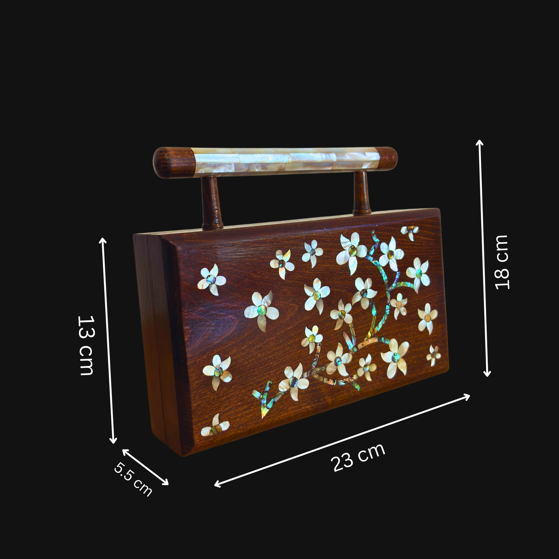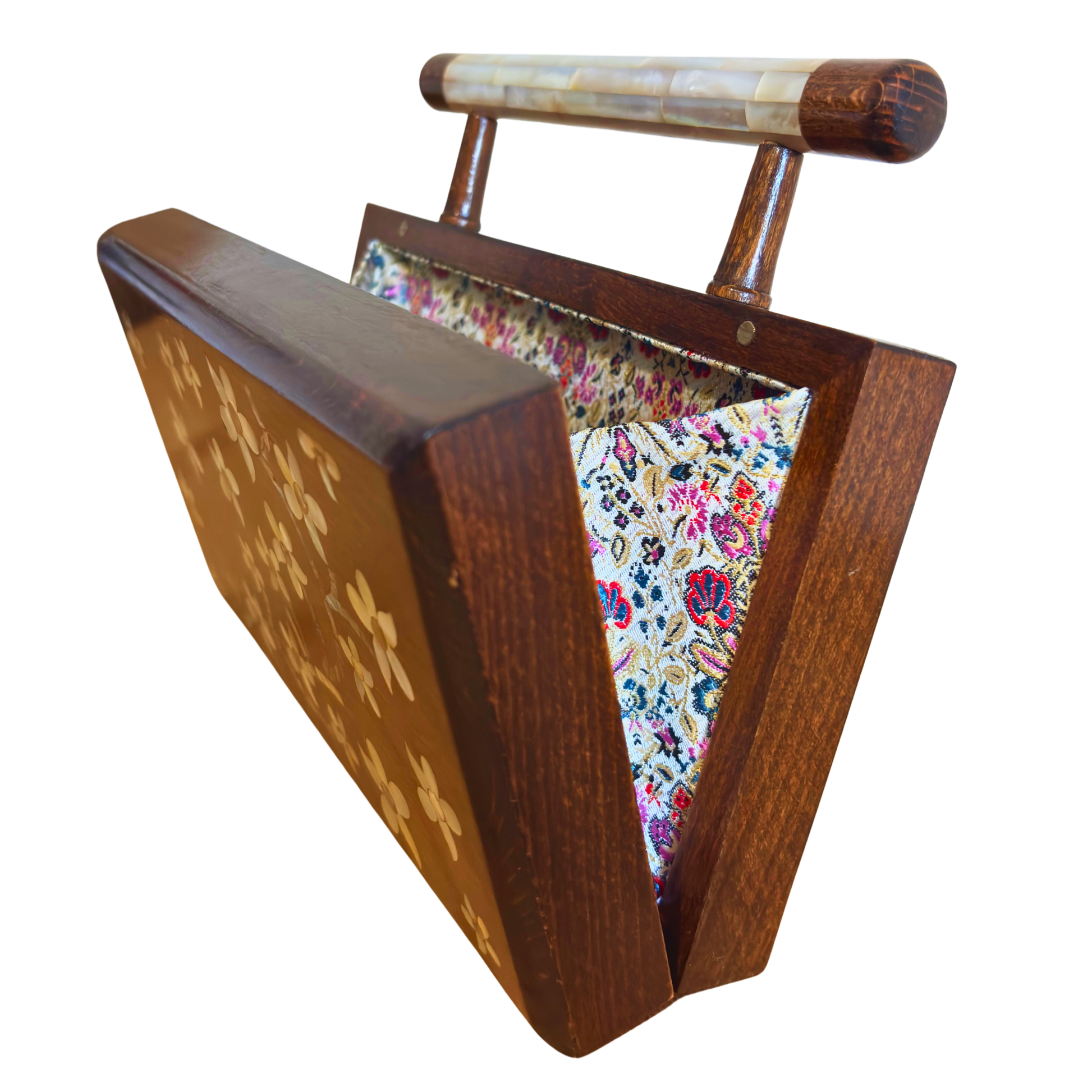 Yasmin clutch, Damascene clutch, jasmine inspiration, mother of pearl, oriental elegance, walnut wood, brocade interior, Damascus craftsmanship