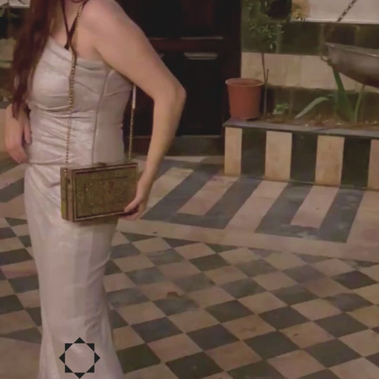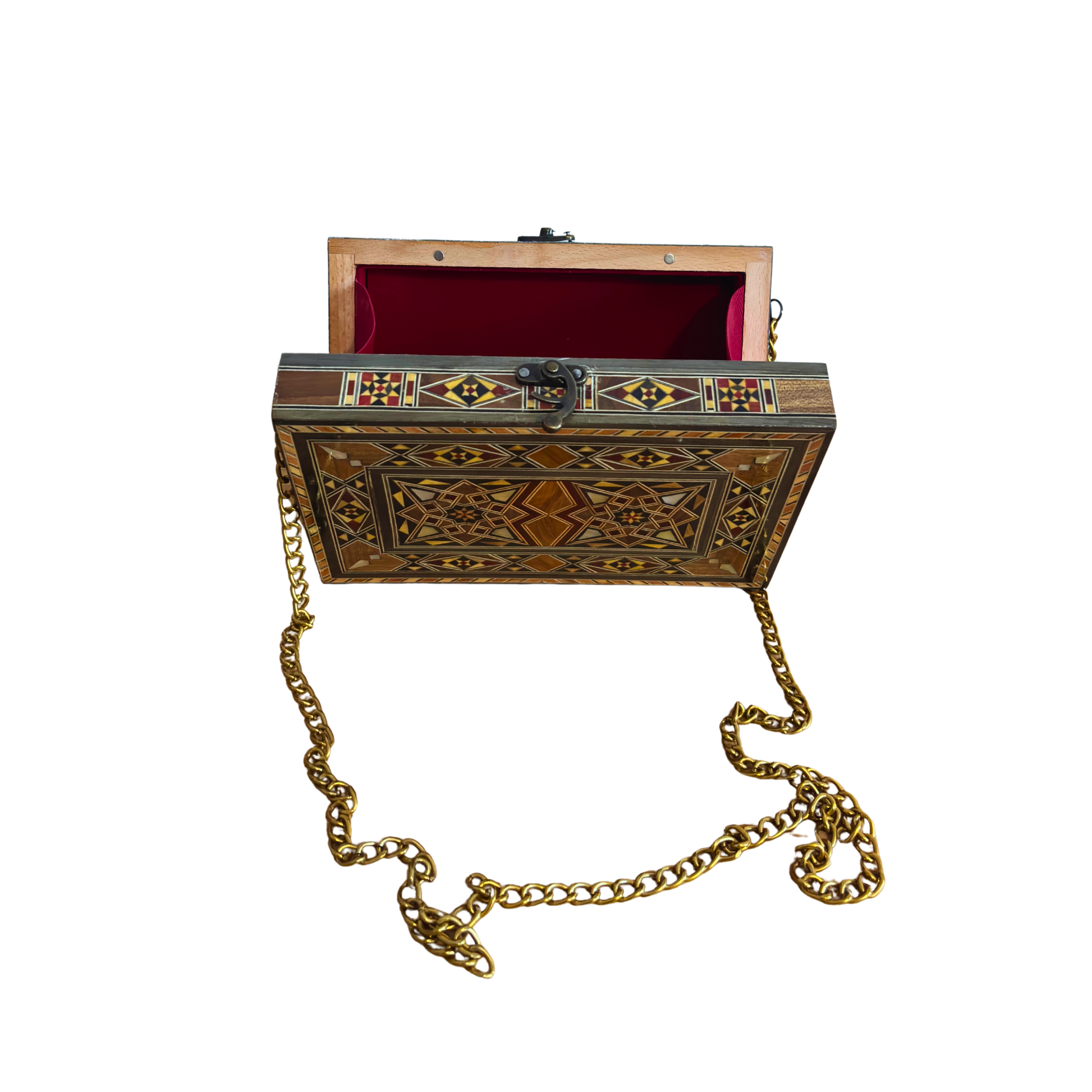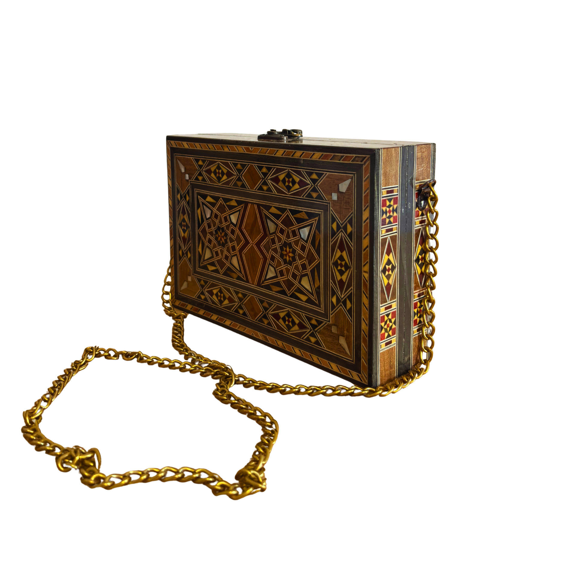 Damascene mosaic handbag, mother of pearl inlay, oriental wooden bag, handcrafted Damascus purse, Syrian mosaic art, luxury evening bag, velvet interior, golden chain, Damascus Box