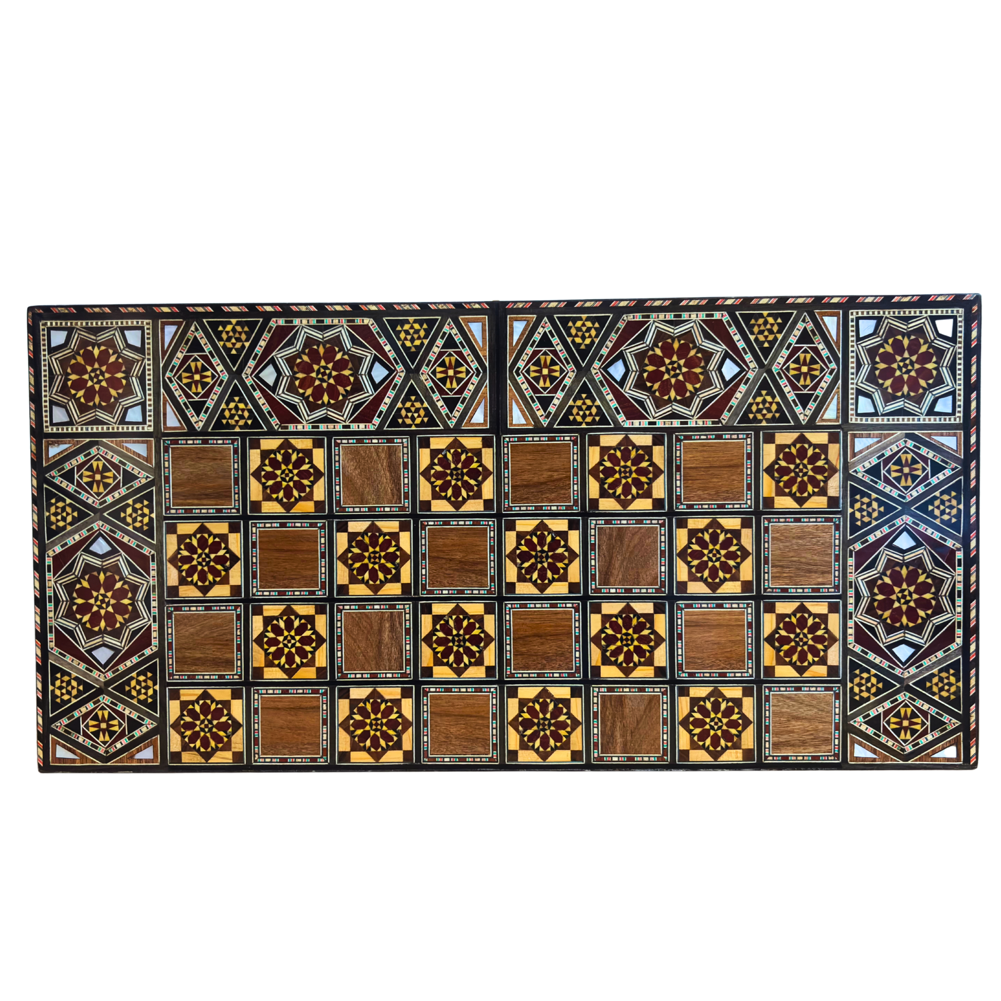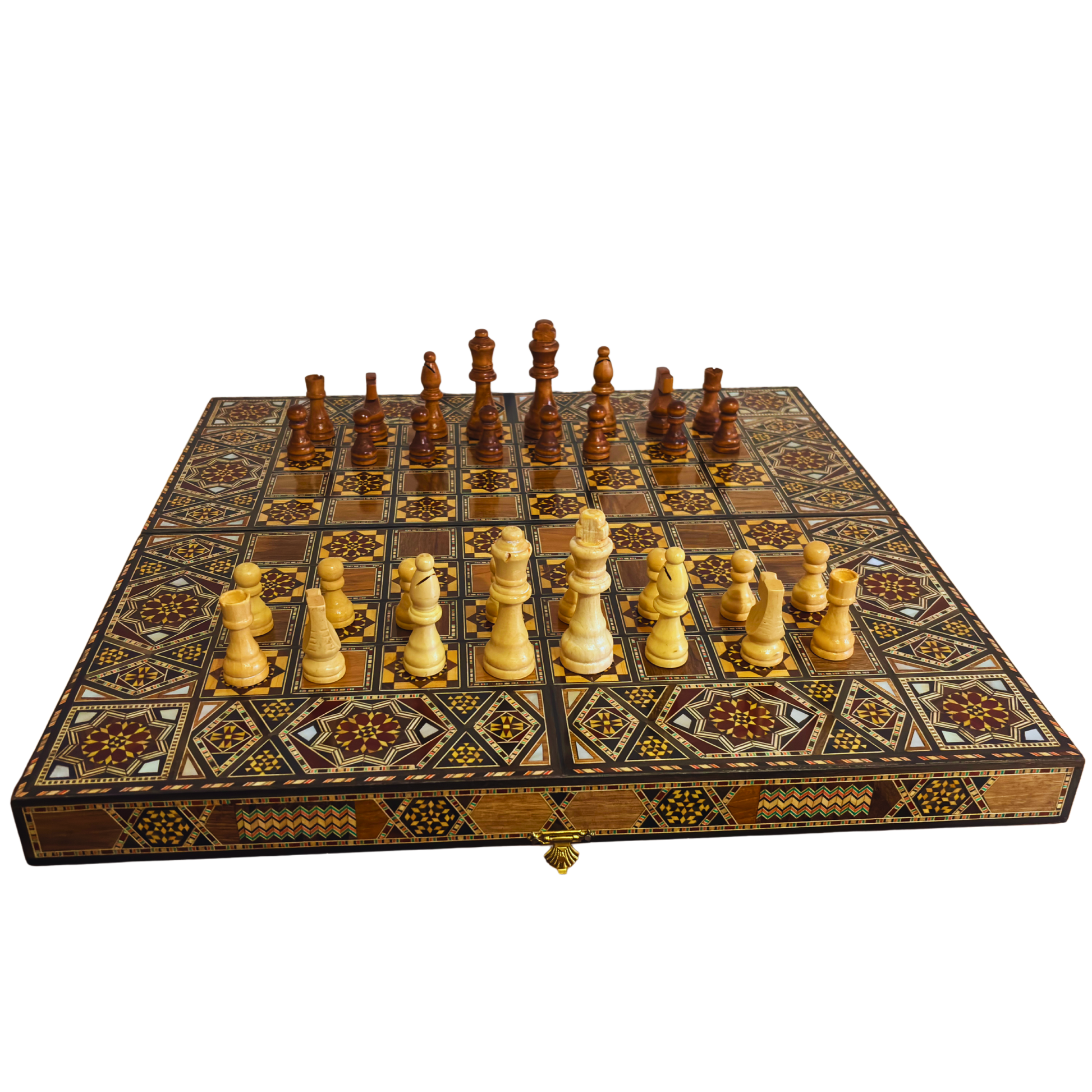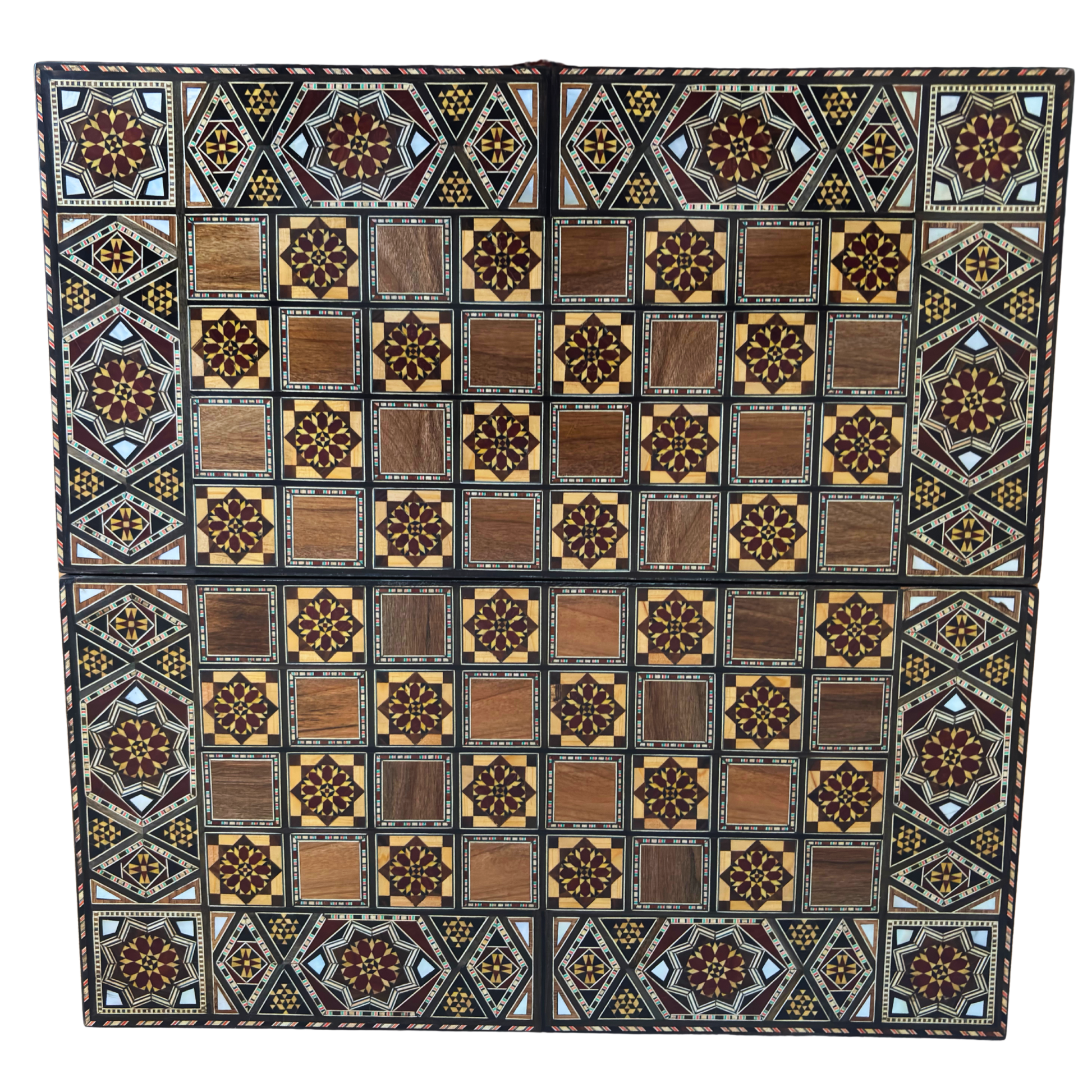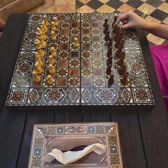 Compact yet striking, this versatile board serves both as a backgammon and chess table, embodying timeless artistry and practical design. The interior reveals intricate geometric patterns, while the exterior reflects the elegance and prestige of Syrian craftsmanship.