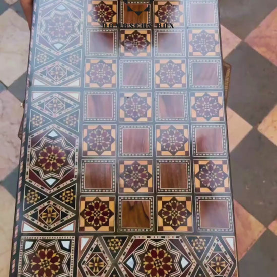 handcrafted backgammon table, chess board table, Gaby Al Dayeh Damascene mosaic, mother of pearl inlay game table, Syrian artisan craft, oriental chess and backgammon, luxury wood game set, Damascus mosaic art, unique collector’s piece, handmade strategy game table