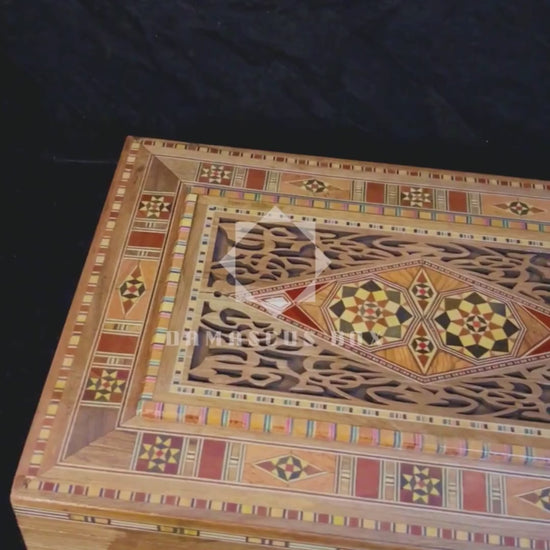 Experience the elegance of traditional Damascus craftsmanship with this large rectangular mosaic box, meticulously handmade from premium Eucalyptus, walnut, lemon, Rose and beechwood. Designed for those who appreciate refined artistry and timeless design, this box is perfect for safely storing jewelry, watches, cigars, delicate keepsakes, or treasured mementos.