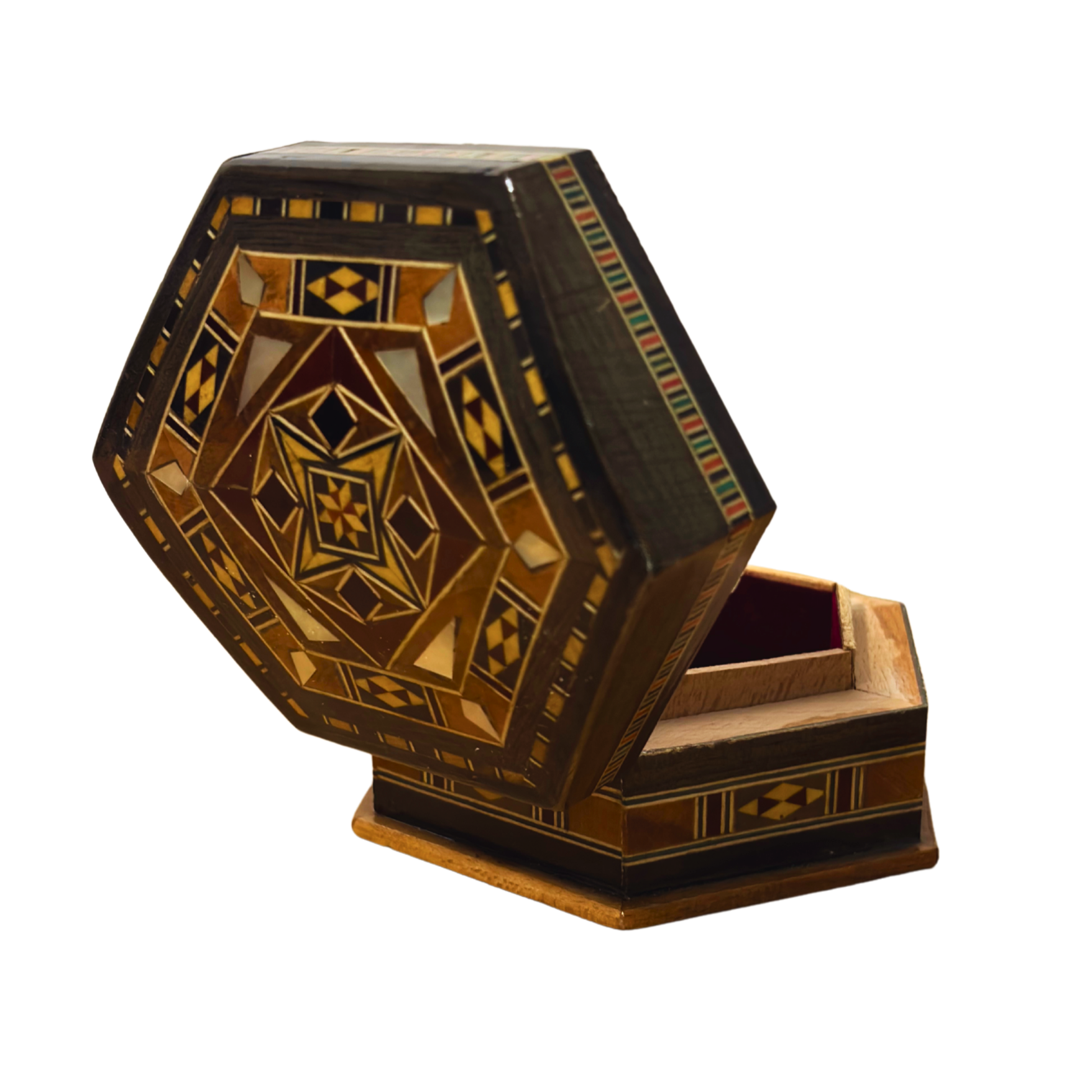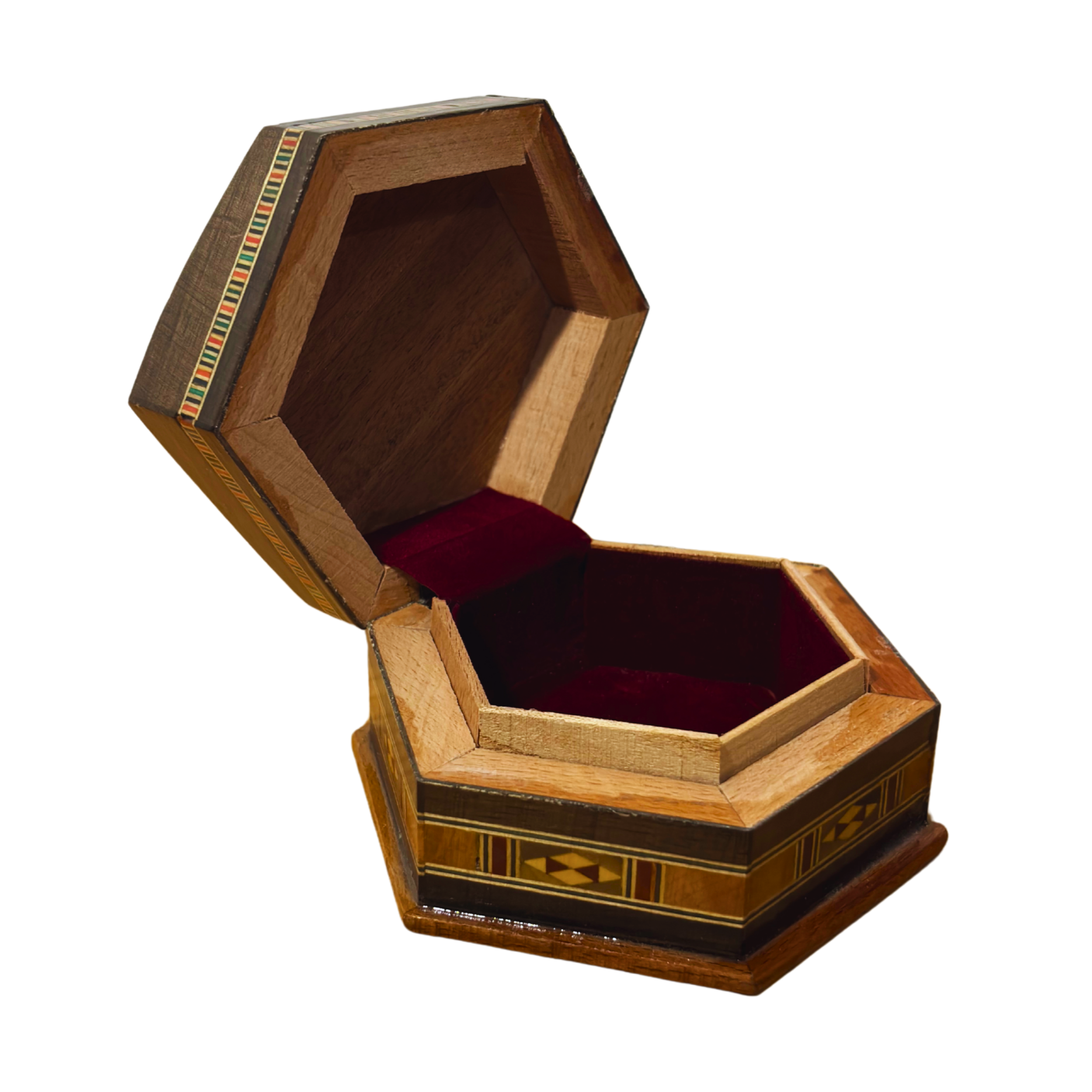 Made from a rich blend of beechwood, walnut, rosewood, lemon wood, and eucalyptus, the hexagonal form enhances the visual rhythm of the mosaic work. The interior is lined with luxurious wine-red velvet, offering elegant protection for jewelry, keepsakes, or small valuables.