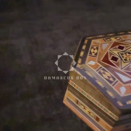 This mosaic box reflects the long-established mosaic tradition of Damascus, celebrated for its precise geometric patterns and balanced composition of natural woods. Each piece is meticulously handcrafted, preserving an authentic artisanal heritage.