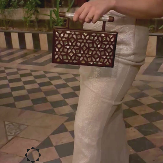 The Garden of Secrets clutch merges geometric and botanical Damascene patterns, a delicate dance between structure and nature.