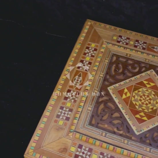 Özel günleri aydınlatacak bu büyük kare mozaik kutu, Şam’da ince kayın, limon, ceviz, okaliptüs ve gül ağacından sevgiyle el yapımı olarak üretilmiştir. Zarif tasarımı ve ustaca işçiliği sayesinde takılarınızı, küçük eşyalarınızı, purolarınızı veya değerli anılarınızı saklamak için hem estetik hem de pratik bir hatıra sunar.