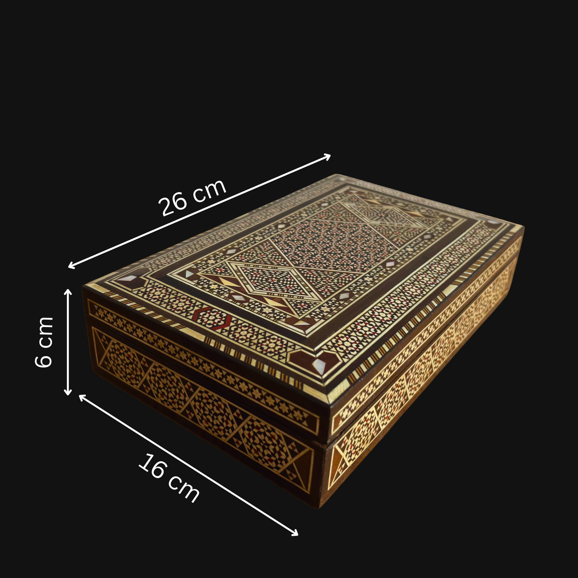 1970 yılına ait bu vintage el yapımı Damask mozaik kutu, koleksiyoncular ve ince işçilik tutkunları için zamansız bir hazinedir. Gerçek sedef kakmalarla işlenmiş olan kutu, geleneksel Suriye sanatından esinlenen zarif geometrik desenleri sergiler. Premium okaliptüs, ceviz, gül, kayın, limon ve sarı çam ağaçlarından üretilmiş olan bu ahşap takı kutusu, kültürel mirası kalıcı bir güzellikle birleştirir.