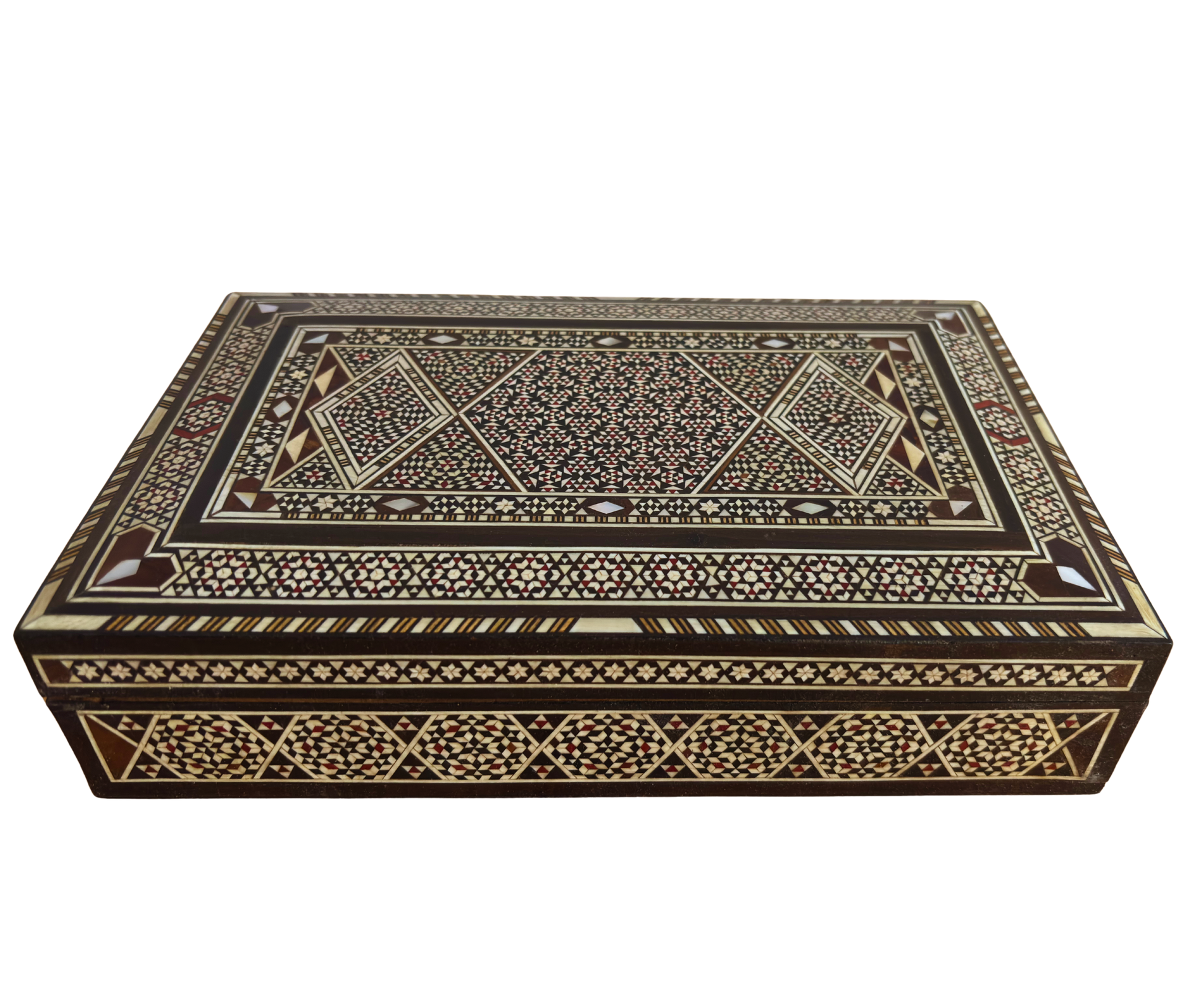 Vintage 1970 Damask Mozaik Takı Kutusu – El Yapımı Ahşap Hatıra Kutusu, Sedef Kakmalı, Suriye Ustası Eseri